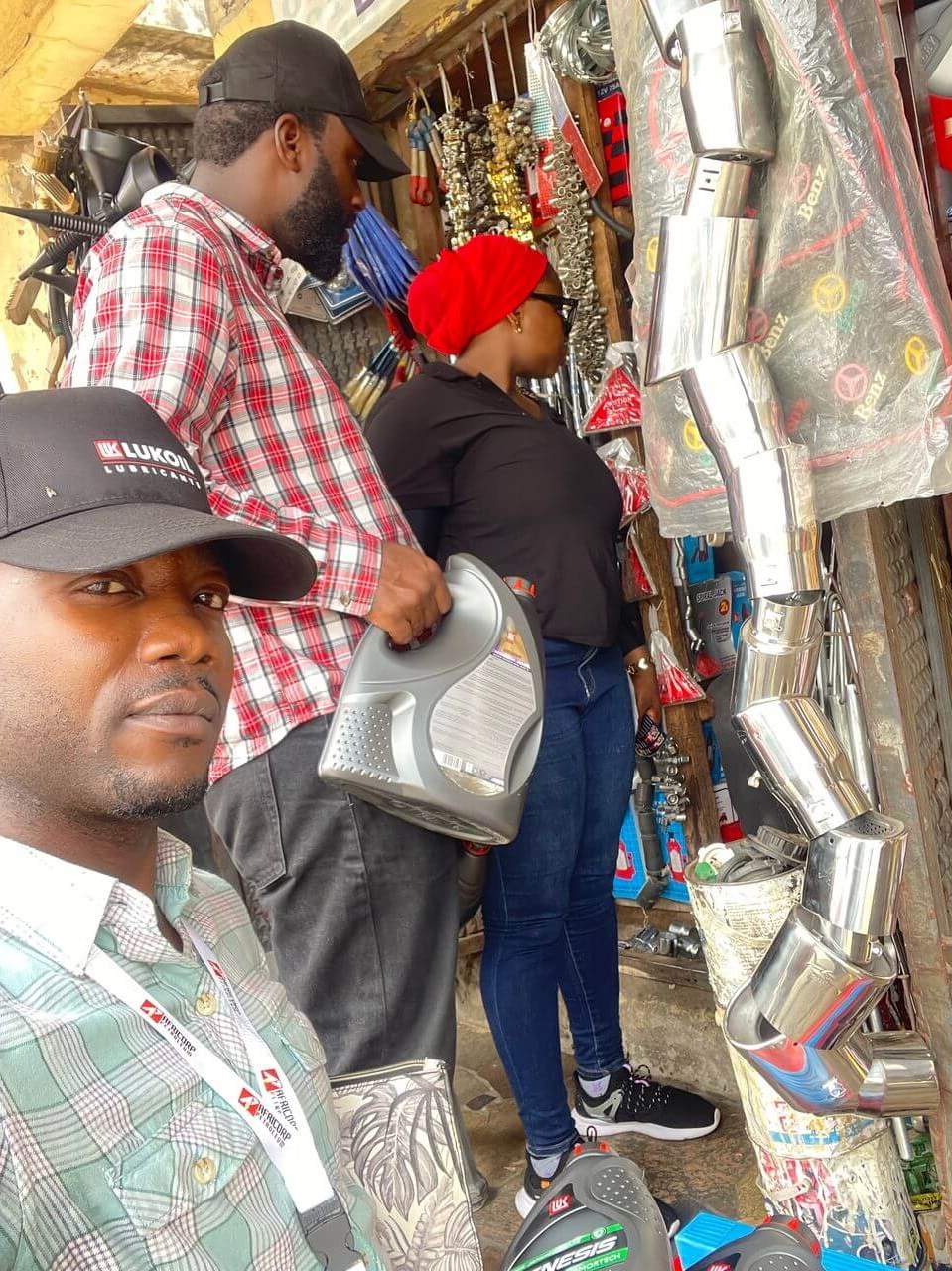 Photo Notes: Market Interaction Moments: Lukoil representatives engaging directly with mechanics and oil retailers at Utako Market, discussing product quality, application, and brand benefits. Product Display Highlights: A showcase of Lukoil’s premium lubricant canisters attracting attention from curious retailers and vehicle owners. Clean packaging and international branding stood out. On-the-Ground Demonstrations: Team members explaining key features of Lukoil lubricants, including viscosity, performance, and authenticity, to retailers and market stakeholders. Retailer Engagement: Snapshots of conversations with shop owners considering retail partnerships. Smiles and handshakes captured the spirit of collaboration. Team Presence in the Market Environment: Photos of Lukoil Nigeria and distributor representatives moving through the vibrant Utako Spare Parts and Lubricants Market, capturing real-time impressions and feedback.